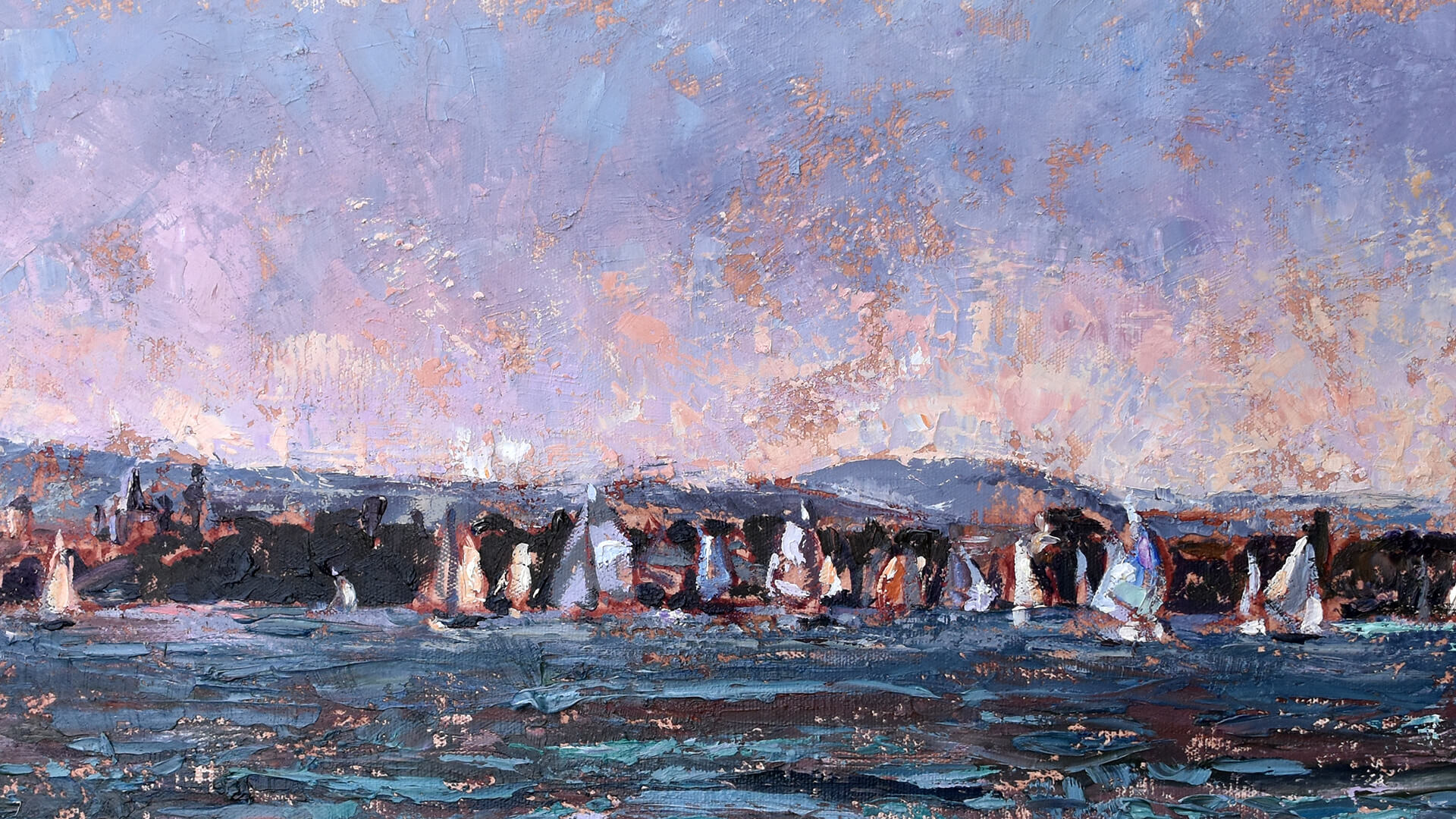 Un ciel poudré rehaussé par la silhouette de la Mandallaz et du vieil Annecy, encadrent la petite régate qui égraine ses bateaux le long de la baie. Je l’ai peinte avec la  joie de celle qui retrouve ses pinceaux après une longue convalescence… Ce qui explique sans doute la fraîcheur de ses coloris.
